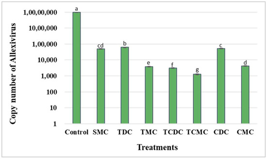 Allexivirus was detected in all treated explants. Hence, we estimated the Allexivirus titre for each treatment through absolute quantification of the copy number using qRT-PCR (Figure 1). TCMC was found to be the most effective treatment, with the lowest copy number (1263.3 ± 60.9), which was 7764.06 times smaller than the copy number in the control plants (9,808,600 ± 89,443). TCDC, TMC, and CMC treatments reduced the copy number of Allexivirus by 3147, 2547, and 2357 times, respectively.