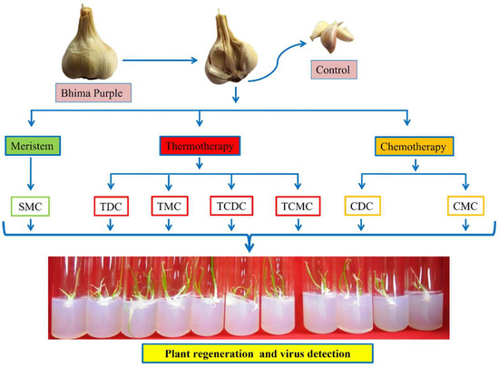 Schematic representation of potyvirus; OYDV, Carla viruses; Garlic common latent virus (GCLV) and SLV and Allexivirus elimination from the Bhima Purple garlic variety. SMC: shoot meristem culture; TDC: thermotherapy direct culture; TMC: thermotherapy meristem culture; TCDC: thermotherapy chemotherapy direct culture; TCMC: thermotherapy chemotherapy meristem culture; CDC: chemotherapy direct culture; CMC: chemotherapy meristem culture.