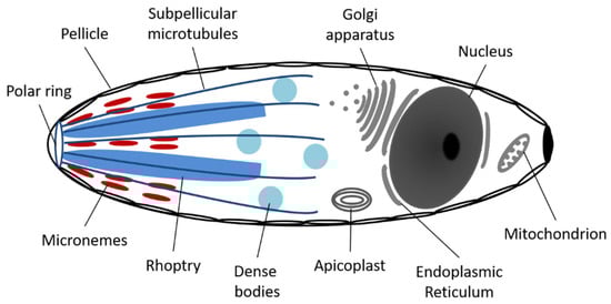 Like all Apicomplexa, each C. felis organism contains a nucleus, endoplasmic reticulum, Golgi apparatus, a mitochondrion, an apicoplast, and a pellicle with an apical complex (Figure 2) []. The first four organelles have functions much like those in other unicellular or multicellular eukaryote organisms, whereas the apicoplast and apical complex are unique to members of this phylum. The apicoplast contains its own circular DNA and is surrounded by triple or quadruple membranes, supporting an endosymbiotic origin. Although the exact function of this organelle is unclear, it has been proposed that it may take part in several potential pathways including the synthesis of fatty acids, heme breakdown, amino acid synthesis, isoprenoid precursors, and/or iron-sulfur clusters []. More studies are needed to fully elucidate the function of apicoplasts in these organisms.
