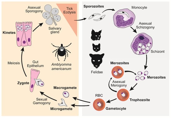Cytauxzoon felis lifecycle demonstrating asexual reproduction within the host felid (right panel) and both sexual and asexual reproduction within the tick transmission vector (left panel). (Wikander Y.M.; Anantatat T.; Kang Q.; Reif K.E. Prevalence of Cytauxzoon felis Infection-Carriers in Eastern Kansas Domestic Cats. Pathogens 2020, 9, 854. https://doi.org/10.3390/pathogens9100854. PMID: 33092245; PMCID: PMC7594093) [].