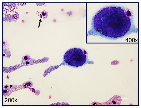 - Sleznikow, C.R.; Granick, J.L.; Cohn, L.A.; Nafe, L.A.; Rendahl, A.; Burton, E.N. Evaluation of various sample sources for the cytologic diagnosis of Cytauxzoon felis. J. Vet. Int. Med. 2021, 36, 126–132. [Google Scholar] [CrossRef]