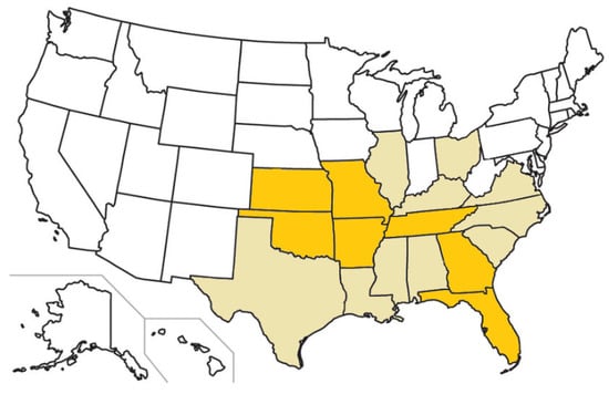 U.S. states with confirmed feline cytauxzoonosis cases (beige and orange) and states in which carrier cat populations have been identified (orange).