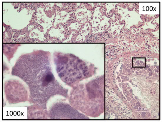 On necropsy, felids that have succumbed to acute cytauxzoonosis demonstrate generalized icterus, splenomegaly, lymphadenopathy, petechia and ecchymosis on the heart and lungs, clear yellow serous pericardial effusion, interstitial pneumonia, and large numbers of schizonts within the vasculature attached to endothelial cells of most organs (Figure 8); with the liver, lung, spleen, and lymph nodes most effected [,,,]. When examined, the brain demonstrates schizogenous vascular occlusion with secondary ischemia and necrosis of neurons as well [,,]. The intravascular mega-schizonts are a prominent diagnostic feature in these cases and typically measure 25–60 μm in diameter, but may reach 250 μm in diameter with an enlarged nucleus, prominent nucleolus, and cytoplasm full of variably mature basophilic merozoites []. The cause of death in acute Cytauxzoon cases is a combination of hypoxic injury and local and systemic immune responses to proinflammatory cytokines leading to poor pulmonary ventilation, decreased gas exchange, and/or a procoagulant state resulting in DIC. Additional studies are needed to determine how the host immune response to this pathogen differs during schizogenous and erythrocytic parasite phases, what factors mitigate those host immune responses, and how we might manipulate the feline immune response to improve survival of these patients.