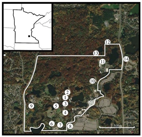 Fall 2020 biting insect trapping locations on the Minnesota Zoo campus as indicated by numbered circles. The white line indicates the zoo’s exterior-most perimeter fence which serves as a barrier to white-tailed deer. (1) Caribou Exhibit; (2) Caribou Holding; (3) Moose Exhibit; (4) Drainage area between the Takin and the Pronghorn Exhibits; (5) Bactrian camel Exhibit; (6) Asian wild horse holding; (7) Bison holding; (8) Exterior location; (9) West compost pad; (10) East compost pad; (11) Quarantine holding area; (12) Lebanon Hills trap 1; (13) Lebanon Hills trap 2; (14) Lebanon Hills trap 3. Locations 8, 12, 13, and 14 are outside of the zoo perimeter fence. Inset: Minnesota Zoo’s location in Apple Valley, MN. Aerial image: 2022 CNES/Airbus: collected 12 October 2020. Accessed via Google Earth Pro, December 2022.