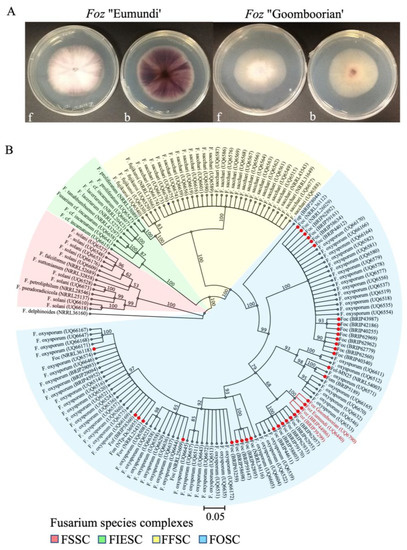 Foz ‘Eumundi’ and Foz ‘Goomboorian’ morphology and their phylogenetic classifications. (A) Colony morphology of the two monoconidial Foz isolates, Foz ‘Eumundi’ and Foz ‘Goomboorian’, grown on full-strength potato dextrose agar for five days. f = front, b = back. (B) Bayesian inference phylogeny reconstructed using translation elongation factor 1-alpha (TEF-1α) sequences representing four Fusarium species complexes (FIESC—Fusarium incarnatum-equiseti species complex; FFSC—Fusarium fujikuroi species complex; FOSC—Fusarium oxysporum species complex; FSSC—Fusarium solani species complex). Pathogenic formae speciales within FOSC are shown with a red circle. Branch labels indicate the posterior probability as a percentage. The Foz node within FOSC is highlighted in red, with its members including Foz ‘Goomboorian’, Foz ‘Eumundi’, Foz BRIP44986, and Foz BRIP39299. A scale range of 0.05 is indicated below the tree.