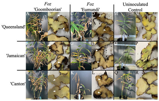 At harvest, inoculated plants showed symptoms considered typical for Foz infection (Figure 2). The first visible symptom of infection was the appearance of bright yellow leaves on individual tillers. Over the next two to five days, these tillers turned orange and then brown before they collapsed. All three genotypes showed external and internal symptoms when inoculated with Foz (Figure 2A–L). Plants typically had symptoms of leaf yellow and tiller collapsing. Both the ‘Queensland’ and the ‘Jamaican’ plants also showed relatively healthy tillers alongside the diseased tillers, a symptom also typical of Foz infection (Figure 2A,C,E,G). Internal symptoms of Foz infection included browning and loss of structure of the rhizomes. Initially, the discolouration occurs in the cortex, eventually spreading throughout the rhizome. When challenged with Foz ‘Goomboorian’, both the ‘Queensland’ and ‘Canton’ displayed browning extending from the cortex into the stele (Figure 2B,J), whereas ‘Jamaican’ had localised discolouration observed in the cortex of the rhizome, but more extensive rotting was also apparent as blackened, shrivelled tissue (Figure 2F). Foz ‘Eumundi’ inoculation produced more severe symptoms compared to Foz ‘Goomboorian’. Sections through the rhizome of ‘Queensland’, ‘Jamaican’, and ‘Canton’ inoculated with Foz ‘Eumundi’ showed advanced rotting and evidence of complete soft tissue collapse, leaving only fibrous material (Figure 2D,H,L). In contrast, the uninoculated plants did not show any external or internal symptoms of Foz (Figure 2M–R). Some blue pigmentation was observed in the uninoculated ‘Jamaican’ rhizomes, typical of this cultivar (Figure 2P).
