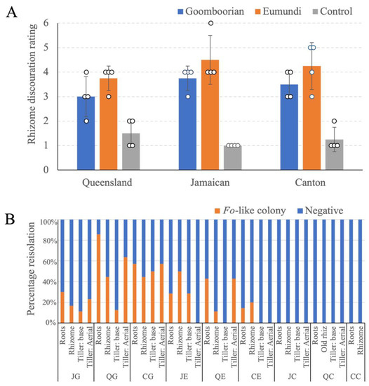 Assessment of symptoms in Foz inoculated plants. (A) Rhizome discolouration in symptomatic and control plants at full harvest (35 days post inoculation). The number of individual plants assessed per genotype (n) is four. Standard deviations from the means are indicated by error bars. (B) Percentage reisolation of Fo-like fungi from tissue samples collected at full harvest. First letter indicates the cultivar, J = ‘Jamaican’, Q = ‘Queensland’, and C = ‘Canton’. Second letter indicates the treatment, G = Foz ‘Goomboorian’, E = Foz ‘Eumundi’, and C = uninoculated control.