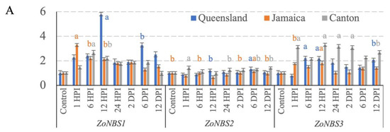 The expression of ZoNBS1 and ZoNBS3 was significantly upregulated at the early time points in all three genotypes (Figure 4A). Amongst the three genotypes, the expression of ZoNBS1 reached the highest magnitude in ‘Queensland’, peaking at 12 hpi, with a 5.8-fold upregulated expression relative to ZoActin. To a lesser extent, ZoNBS1 was up-regulated by a maximum of 3.3-fold relative to ZoActin at 1 hpi in ‘Jamaican’ and a maximum of 2.7-fold relative to ZoActin at 6 hpi in ‘Canton’ (Figure 4A). After the expression peaks were reached, all three genotypes showed a downregulation of ZoNBS1 over time, suggesting that ZoNBS1 upregulation was specific to the early time points and may be important in regulating plant responses at the onset of infection. ZoNBS2 expression levels were comparable to that of the control throughout the time course, although it was slightly up-regulated at 1 hpi in ‘Canton’ and 6 dpi in both ‘Queensland’ and ‘Jamaican’ (Figure 4A). ZoNBS3 transcripts were rapidly induced early on in all three genotypes, starting at 6 hpi in ‘Queensland’ and at 1 hpi in both ‘Jamaican’ and ‘Canton’ (Figure 4A). Up-regulation of ZoNBS3 was the highest in ‘Canton’ and appeared to be maintained at 1 hpi, 12 hpi, 24 hpi, and 2 dpi, suggesting that, unlike ZoNBS1, ZoNBS3 is associated with the attenuation of the ginger defense response over an extended period. ‘Queensland’ and ‘Jamaican’ showed a similar profile with less magnitude of expression in comparison to ‘Canton’. Taken together, all three ZoNBS genes showed differential profiles upon Foz challenge, and the magnitude of expression appeared to be cultivar-dependent.