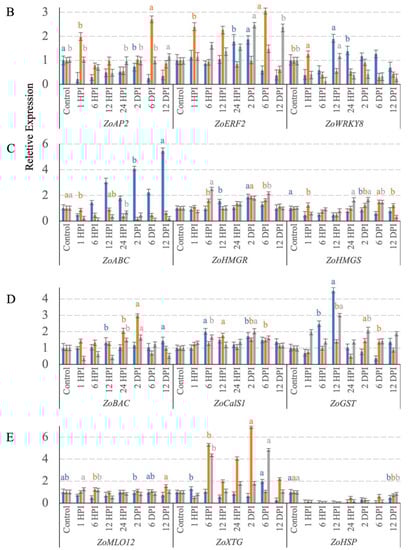The relative expression levels of target genes against ZoActin in Foz-infected ginger roots at 1, 6, 12, and 24 h post inoculation (hpi), as well as 2, 6, and 12 days post inoculation (dpi). Gene expression profiles are shown for (A) NBS-LRR resistant (R) genes ZoNBS1, ZoNBS2, and ZoNBS3. (B) Transcription factors, ZoAP2, ZoERF2, and ZoWRKY8. (C) Terpenoid-synthesis-related genes, ZoABC, ZoHMGR, and ZoHMGS. Cell-wall-associated genes, (D) ZoBAC, ZoCalS1, and ZoGST and (E) ZoMLO12, ZoXTG, and ZoHSP. Standard deviation (±SD) is calculated from three biological replicates per genotype per time point. Significant expression differences amongst each genotype were determined by one-way ANOVA. Means were separated by least significant difference (LSD) tests at p ≤ 0.05. For each genotype, two expression values with the most significant p values are indicated by letters a and b in superscript. Expression profiles are colour-coded according to their genotype. Z. officinale cultivar ‘Queensland’ = blue, ‘Jamaican’ = orange, and ‘Canton’ = grey. Colour codes also apply to the statistics performed on each genotype.