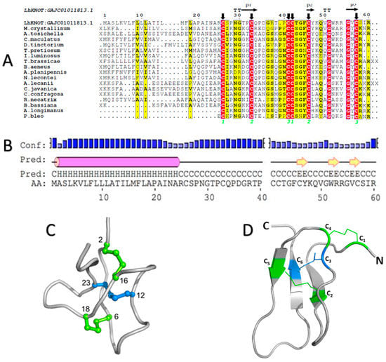 - Barbault, F.; Landon, C.; Guenneugues, M.; Meyer, J.P.; Schott, V.; Dimarcq, J.L.; Vovelle, F. Solution structure of Alo-3: A new knottin-type antifungal peptide from the insect Acrocinus longimanus. Biochemistry 2003, 42, 14434–14442. [Google Scholar] [CrossRef]
