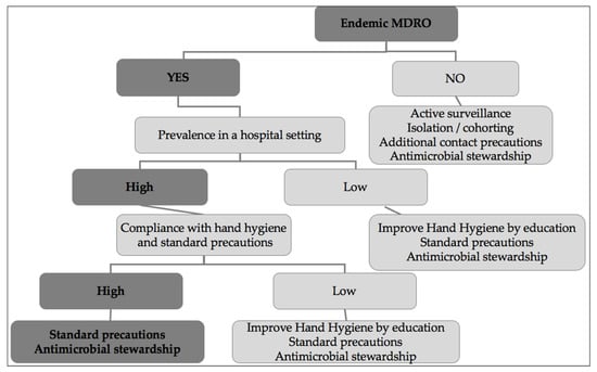We propose targeted strategies in hospital settings adapted to the epidemiological characteristics of different MDROs based on whether the MDRO is endemic or not (Figure 1). In LMICs, in a setting where a MDRO is endemic and its prevalence is high, high compliance with hand hygiene and effective antimicrobial stewardship program could be sufficient to limit the risk of transmission. However, if compliance with hand hygiene is low, contact precautions must be applied in addition to education programs aiming to improve hand hygiene application. In a context of endemic MDROs with low prevalence in the setting, effective hand hygiene measures and antimicrobial stewardship can be sufficient to prevent the risk of transmission if continuous education programs are arranged focusing on improving hand hygiene. As for HICs where MDROs are not endemic, the application of international infection-prevention policies relying on screening, isolation, and cohorting strategies for colonized patients should be considered.