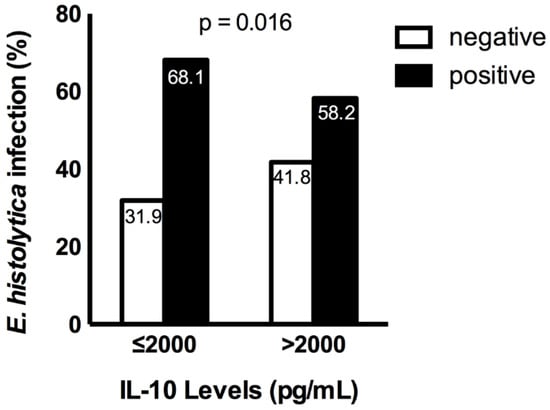 The distribution of E. histolytica among patients with lower IL-10 concentrations compared to those with higher concentrations of IL-10.