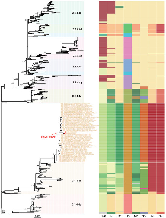 Phylogenetic tree of H5N1 viruses sequenced in this study, in addition to other publicly available H5Nx clade 2.3.4.4 from GenBank and GISAID. Red dots represent the H5N1 viruses sequenced in this study. Topological support values (SH-like support) of selected nodes are displayed. To the right, a schematic representation of viral clustering of each gene segment (from left to right: PB2, PB1, polymerase acidic, haemagglutinin, nucleoprotein, neuraminidase, matrix, and non-structural) is shown. Segment colors indicate origin of the segment. Within each cluster, a unified color pattern indicates homogeneity and a different color pattern indicates reassortment.