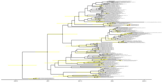 - Suchard, M.A.; Lemey, P.; Baele, G.; Ayres, D.L.; Drummond, A.J.; Rambaut, A. Bayesian phylogenetic and phylodynamic data integration using BEAST 1.10. Virus Evol. 2018, 4, vey016. [Google Scholar] [CrossRef]