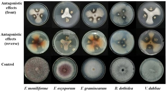 Antagonistic effect of strain Oj-2.16 on the growth of five species of fungal pathogens.