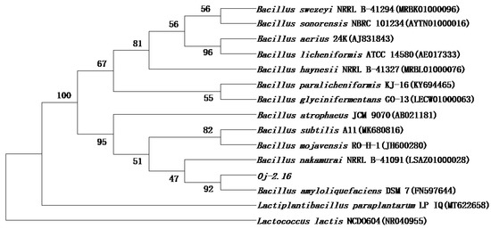 The genomic DNA of strain Oj-2.16 was isolated and amplified with PCR. The size of 16s rDNA amplicon was 1421 bp (GenBank accession number MT830870). The BLAST results showed that strain Oj-2.16 had 99.79% sequence identity with B. amyloliquefaciens (FN597644) [23]; both were clustered into one branch by phylogenetic tree construction (Figure 3). On the basis of physiological and biochemical properties and 16s rDNA sequence analysis, strain Oj-2.16 was identified as B. amyloliquefaciens.