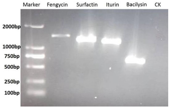 DNA was amplified by primers for lipopeptide genes, including surfactin, fengycin, iturin, and dipeptide gene bacilysin (Table 1). The PCR mix was the same as in Section 2.6, and the PCR reaction conditions were 94 °C for 5 min; followed by 32 cycles of 94 °C for 15 s, annealing at 55 °C for 15 s, and extending at 72 °C for 30 s/kb; and finally, extending at 72 °C for 10 min [18]. The PCR fragments were visualized by 1% DNA agarose gel electrophoresis.
