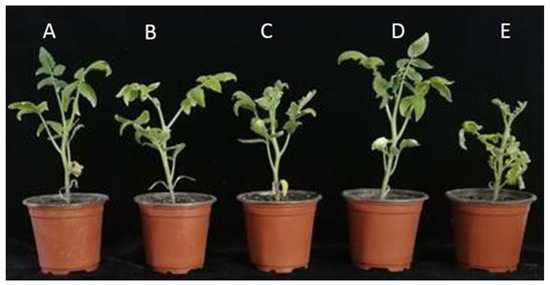 Effects of strain Oj-2.16 against Verticillium wilt disease and on growth promotion of tomato seedlings. (A) Inoculation of Vd and strain Oj-2.16; (B) Vd inoculation and carbendazim treatment; (C) aseptic distilled water; (D) only strain Oj-2.16 inoculation; (E) only Vd inoculation.