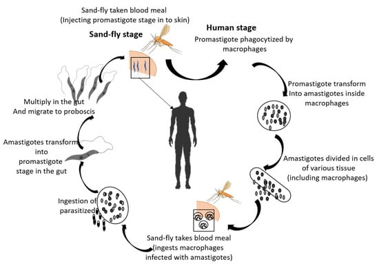 Leishmania is transmitted through the bite of a female sandfly that belongs to the genus Phlebotomus. In sandflies, it promotes the development of Leishmania and transmits it through host inflammasome–mediated interleukin (IL)-1beta that amplifies neutrophil recruitment. Neutrophils are central to acute inflammation caused by bite specific mediators, but dermal resident macrophages are gaining attention as participants that harbor Leishmania parasite infection [49,50]. Leishmania parasites are present in two categories. These are promastigote, a flagellated type possessed by sandflies, and amastigote, a non-flagellated form found in the phagosomes of macrophages in mammalian hosts. When a diseased sandfly bites the host, it transmits in a promastigote form that enters phagocytic cells. Within the phagocytic cell, it transforms into amastigotes, and the replicative amastigotes go into the sandfly while feeding the infected host. The amastigotes inside the sandfly undergo various transformations, with non-infected stages. In the primary stage, it develops a procyclic promastigote that converts into an elongated motile nectomonad promastigote, and then it transforms into a small replicative form, the leptomonad promastigote. This allows flies to start a second growth cycle in the anterior midgut and prepare to re-infect fresh phagocytes [8,51,52]. Moreover, amastigotes are the intracellular form of the parasite; information gained from these proteins has contributed significantly to the enhancement of resources for the identification of therapeutic targets and represents a promising field for the discovery of new pathogenic markers [53].