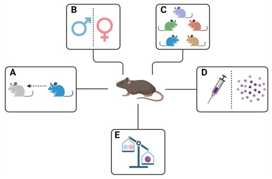 Representation of the traits that can influence development of tuberculosis: (A) Aging; (B) Differences between sexes; (C) Genetic differences between different lineages of mice; (D) The route of infection (intravenous or aerosol); (E) Immunocompromising elements that can unbalance the immune response against infections (e.g., diabetes, coinfections, etc.).