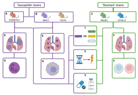 There are different mice lineages for the study of tuberculosis, each one with its own distinctive genetic background. Generally speaking, mice lineages can be divided in two big groups: “resistant” to TB infection and “susceptible” to TB infection. It should be clarified that mice are considered as “tolerant” hosts for the infection, as they are able to deal with elevated mycobacterial burden without compromising their survival [60], but it is true that certain lineages of mice present different resistance levels to the infection.
