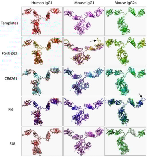 Structural alignment of B12 (human IgG1), Mab-61.1.3 (mouse IgG1), and MAB231 (mouse IgG2a) (templates) with the corresponding predicted 3D structures of F045-092, CR6261, FI6, and 5J8. Only heavy chains (VH, hinge region, CH1-CH3) of templates and predicted mouse models are presented. Arrows illustrate structural variations in VRs.