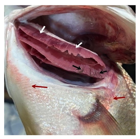 Moron labrax showing hemorrhagic areas on different parts of the body surface (red arrows), a marbling appearance (white arrows), and gill tips that were attached in some areas with mucous secretion, and the parasites were seen by naked eyes as black filaments (black arrows).