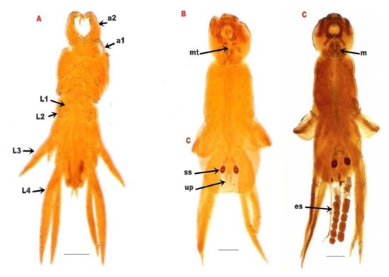 (A): L. kroyeri premature stage. (B): male L. kroyeri. (C): female L. kroyeri. a1; 1st antenna. a2; 2nd antenna. L1; 1st thoracic leg. L2; 2nd thoracic leg. L3; 3rd thoracic leg. L4; 4th thoracic leg. m; maxilliped. mt; mouth tube. es; egg sac. ss; spermatophore sac. up; uropod. Scale bars = 500 μm.