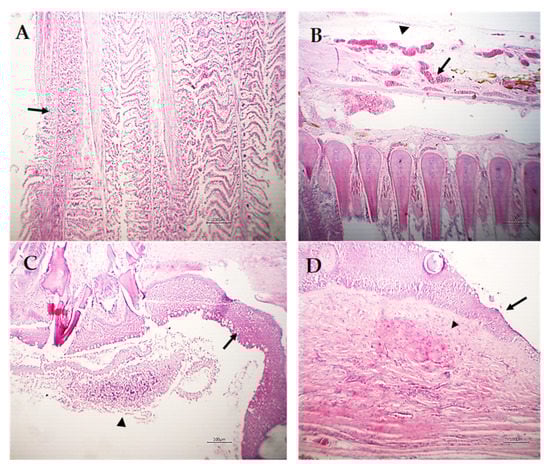 Photomicrograph of M. labrax gills stained with H&E. (A) Parasitic elements embedded between gill filaments (arrows) with stunted, bent, and disorganized primary filaments (arrowhead). (B) High power of the previous picture showing parasitic sections (arrows) with partial destruction of the lamellar epithelium (arrowhead) or metaplasia to mucus-secreting cells. (C) Gills showing parasitic sections (thin arrow), intense hemorrhage on the gill surface (arrowhead), and mucous exudate (thick arrow). (D) Gills showing denuded of primary filaments (arrow) with complete destruction of the secondary lamellae of some filaments. Scale bar = 100 µm.