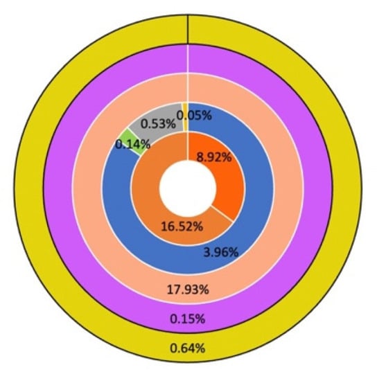 We employed RepeatModeler2 to annotate transposable elements (TE) in the EU-B04 genome assembly. The approach overcomes several drawbacks of the previous RepeatModeler method, notably the lack of a comprehensive, nonredundant library of full-length consensus sequences [26]. We also utilized its built-in optional LTR module to find LTR elements in the genome. A total of 48.83% of the EU-B04 genome was found to consist of various types of repetitive elements, of which 25.44% were class I LTR elements, mainly Gypsy/DIRS1 (15.52%) and Ty1/Copia (8.83%) superfamilies. Class II elements, accounting for 4.68% of all detected repeats, were mostly from the hobo-Activator superfamily (3.96%). Transposable elements of unknown type were found to account for 17.93% of the identified transposable elements. Figure 1 gives a detailed description of the repeats detected in the EU-B04 genome. Overall, the findings showed that only 51.17% of V. inaequalis genome belongs to a non-repetitive region containing all biological genes and other regulatory sequences.