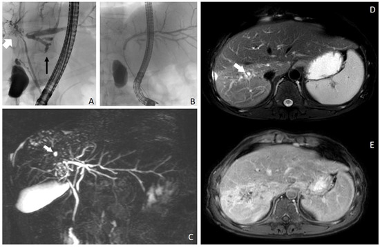 (A–E). ERCP revealed dominant stricture of the common biliary duct, atrophy of the right (white arrow) biliary system and hypertrophy of the left (black arrow) biliary system (A). Dilatation of the perihiliary left bile duct (B). In (C), maximum intensity projection of a 3D image using magnetic resonance cholangiopancreatography (MRCP), showing rarefication of the right sided bile ducts (especially segments VI and VII) with small cystic lesions (white arrow). MRI images show alterations of liver parenchyma in segments VI and VII. On fat-suppressed T2-weighted images (D), signal intensity increase is seen in segments VI and VII. The bile ducts are scarcely visible. Some small cystic lesions are seen in the corresponding segments (white arrow). These changes were interpreted as segmental changes due to primary sclerosing cholangitis. On contrast-enhanced fat-suppressed T1-weighted images (E), diffuse contrast enhancement is visible in segments VI, VII and VIII, which was attributed to inflammation.