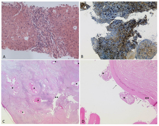 (A–D). (A): Liver biopsy three years before transplantation: Chronic-active, predominantly portal and discrete lobular inflammatory infiltrate with low activity and few eosinophilic granulocytes. No histological signs of infection by E. multilocularis were detected (HE, ×200). Several biopsies of the large bile ducts were taken during the months before transplantation. In the last biopsy ((B), ×100), two months before transplantation, large amounts of IgG4-positive plasma cells were visible (>80/HPF). Post-transplantation: (C): The histology of the explanted liver showing the laminated layer of E. multilocularis (*) in close proximity to a large bile duct (**) in the hepatic hilus region. The inflammatory reaction resulted in the compression and destruction of the bile duct (HE, ×12.5). (D): Magnification of a metacestode (HE, ×100). Remnants of two protoscolices (*), the laminated layer (**) and the delicate germinal layer (arrows) are shown.
