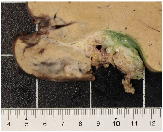 The explanted liver weighed 1204 g and measured 210 × 180 × 80 mm. The right lobe was atrophic and showed several retractions of the capsule. On sections (including the hilus region, Figure 3), multiple, rounded, abscess-like lesions up to 14 mm became visible, some of them containing greenish fluid, while others showed calcified rims.