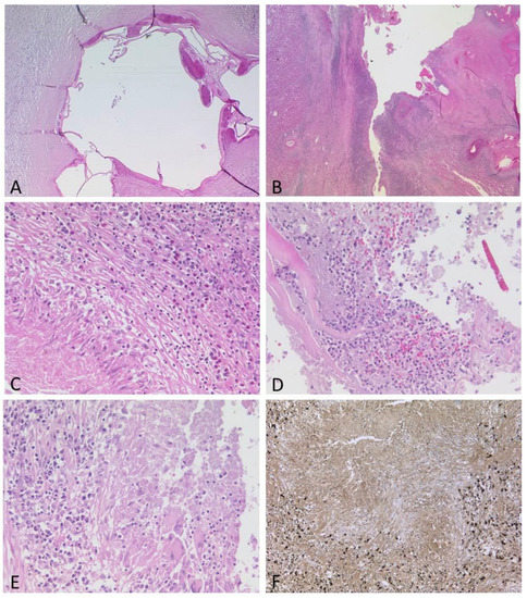 In some areas, the adjacent liver tissue was fibrotic or hemorrhagic. The histology of the explanted liver revealed multiple metacestodes of Echinococcus multilocularis with fragments of the eosinophilic laminated layers (Figure 2C,D and Figure 4A,D. The amount of IgG4-positive plasma cells was strikingly increased (Figure 4F).