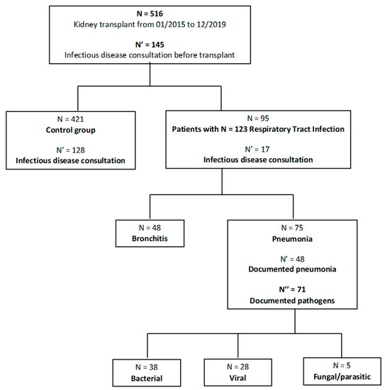 Among infections, bacterial urinary and respiratory tract infections are the most frequent after kidney transplantation [4,10] It is estimated that up to 20% of kidney allograft recipients will suffer from respiratory tract infections (RTIs) [11,12]. RTIs develop regardless of post-transplant period and immunosuppressive regimen [13], and kidney transplant patients are particularly susceptible to acute respiratory distress syndrome (ARDS) and respiratory failure upon infection [14]. The occurrence of RTIs adversely affects graft survival, morbidity, and mortality after kidney transplantation [15,16,17]. Therefore, preventive strategies have been established, including screening for and treatment of latent tuberculosis, prophylaxis against Pneumocystis jirovecii, and systematic update of the recommended vaccine schedule before transplantation. These strategies may be implemented during a dedicated infectious disease consultation (IDC) [18,19], resulting in better adherence to vaccination before transplantation [20], and multiple transplantation centers have integrated IDC in common practice [21].