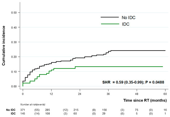 In unadjusted logistic regression analysis, risk factors for RTIs after kidney transplantation were recipient age (OR = 1.02 (1.00–1.04), HIV and HCV infection (OR = 4.51 (2.21–9.23) and OR = 6.34 (2.93–13.70), respectively), and combined liver/kidney transplants (OR = 2.65 (1.13–6.19)). In contrast, IDC before transplantation was associated with 50% reduction in RTIs (OR = 0.50 (0.28–0.88)) (Table S1). Multivariable analysis found HIV, HCV, recipient age, and pretransplant donor-specific anti-HLA antibodies as independent risk factors of RTI, while IDC was confirmed as an independent protective factor (OR = 0.48 (0.26–0.88) (Table 3). Cumulative incidence estimates of RTI according to pretransplant IDC are shown in Figure 2, confirming a protective effect in a competing risk time-to-event analysis framework (SHR = 0.59 [0.35–0.99], p = 0.049).
