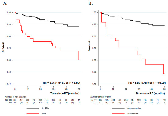 Overall survival curves according to the occurrence of (A) respiratory tract infection (RTIs) or (B) pneumoniae. Hazard ratios (HR) from time-dependent Cox regression analysis.