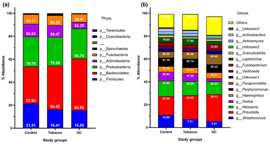 In this study, we have analyzed a larger population group for accurate information regarding the study population compared to an earlier published report [13]. The present study reveals five phyla and 23 genera contributing to approximately 90% of the total oral microbiome composition. The abundance of Bacteroidetes and Proteobacteria observed was highest in the OC group as compared to the other two study groups. These phyla are composed mainly of Gram-negative bacteria, whereas Proteobacteria includes mainly Gram negative pathogenic bacteria [17]. The increased presence of Gram-negative bacteria in the oral microbiota of OC patients has been previously reported [18]. Apart from the five major phyla, the abundance of phyla Spirochaetes was highest in the tobacco group, and the presence of phyla Tenericutes was observed in tobacco and OC groups only, which could be attributed to the presence of periodontal pathogens in tobacco chewers and diseased conditions in OC [19]. The abundance of genera Streptococcus, Rothia, Veillonella, and Neisseria was found to decrease in individuals suffering from OC compared to those in healthy controls, owing to the mentioned genera being part of the healthy oral microbiota in humans. Therefore, their high abundance in controls is due to a healthy oral cavity, whereas their decreased abundance in OC and tobacco chewers could be due to dysbiosis in the oral cavity of the said individuals. On the other hand, genera such as Prevotella, Haemophilus, and Fusobacterium are known pathogens of the oral cavity, thereby justifying their increased counts in the OC and tobacco chewing [20]. The increased abundance of Prevotella and Fusobacterium in tobacco chewers leads to the synergistic activity of toxins from the bacteria and nicotine, thereby leading to detrimental health effects [10]. Fusobacterium spp. Has been linked to cell adhesion, tumorigenesis, epithelial-to-mesenchymal transition, inflammasomes, the cell cycle, and other aspects of oral cancer [21,22].