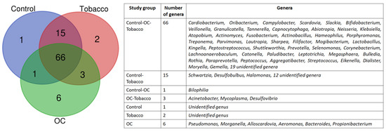 When the bacterial makeup of the three research groups is compared, it is observed that the abundance of major genera in tobacco chewers lies in between that of the control and OC populations. Similarly, beta diversity plots display the clustering of control and tobacco samples together, compared to OC samples that cluster away. Considering all of the parameters, it can be concluded that the composition of tobacco chewers is comparable to both the control and OC populations in several aspects, indicating the transitional phase of the tobacco chewers’ oral microbiota. Apart from OC, there are a few reports on the oral microbiota of oral potentially malignant disorders (OPMD). OPMD progresses to oral cancers through a series of histopathological stages, beginning with hyperkeratosis/hyperplasia and progressing to various degrees of dysplasia. Similar to the microbiota of tobacco chewers and the oral cancer identified in this study, the abundance of the phyla Bacteroidetes and Proteobacteria were higher, whereas that of Firmicutes was lower in the OPMD group. At the genus level, Alloprevotella, Leptotrichia, Fusobacterium, Campylobacter, Neisseria, Gemella, and Granulicatella were found in higher abundance in OPMD, similar to tobacco chewers and OC patients as compared to the control group reported in this study [26,35].
