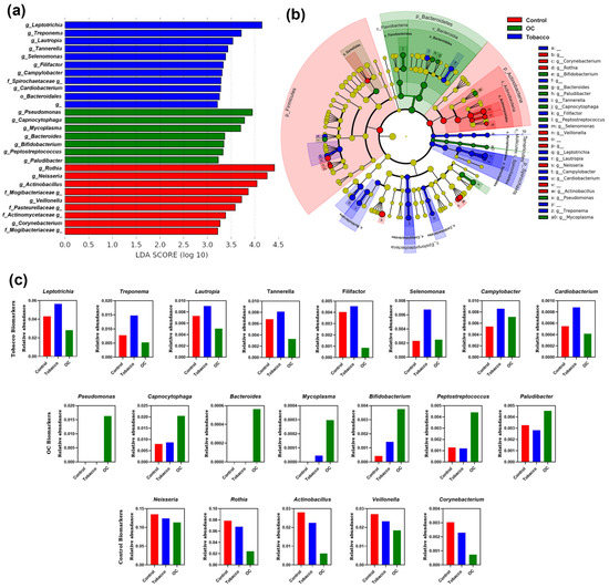 Distinct taxa were identified in the C, T, and OC groups using LEfSe analysis. (a) LDA scores showed significant bacterial differences within groups at the genus level; (b) a Cladogram was constructed using the LEfSe method to indicate the phylogenetic distribution of bacteria that were remarkably enriched in the control, tobacco, and OC groups; (c) and the mean relative abundance of biomarker taxon across all study groups.