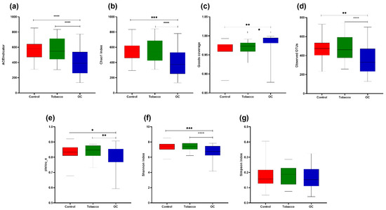Alpha diversity indices for the study groups; (a) ACE indicator; (b) Chao1 index; (c) Goods coverage; (d) Observed OUT’s; (e) pielou_e; (f) Shannon index; (g) Simpson index. (* p < 0.05, ** p < 0.01, *** p < 0.001. **** p < 0.0001).