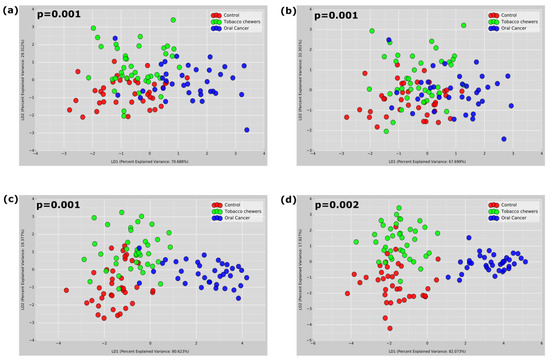 Beta diversity LDA plots depicting sample diversity between groups; (a) Bray- Curtis plot; (b) Jaccard matrix; (c) Unweighted Unifrac matrix; (d) Weighted Unifrac matrix.