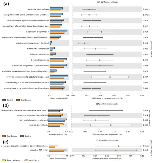 We used the Phylogenetic Investigation of Communities by Reconstruction of Unobserved States (PICRUSt2) method to envisage oral microbial roles linked to the formation of OSCC, and MetaCyc pathways were constructed for the study groups. PICRUSt2 estimates which gene families are present using an extended ancestral-state reconstruction technique, and then joins gene families to provide a comprehensive metagenome of the data. Significantly upregulated pathways related to amino acid biosynthesis (aspartate, lysine, methionine, threonine, isoleucine, valine), sugar fermentation (glycolysis, Entner-Doudoroff, pyruvate), and pyrimidine salvage and biosynthesis were detected in healthy controls as compared to the OC group (Figure 6). Conversely, pathways related to Co-enzyme A (p = 0.024), aspartate, asparagine (p = 0.023), lipid biosynthesis (p = 0.042), and fatty acid elongation (p = 0.038) were upregulated in the OC group as compared to controls. The tobacco group revealed upregulated pathways related to the reductive TCA cycle (p = 0.010) and pyrimidine biosynthesis (p = 7.95 × 10−3) as compared to the OC group.