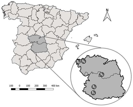 Location of the five selected study sites (S1 to S5) within Toledo and Ciudad Real provinces in peninsular Spain.