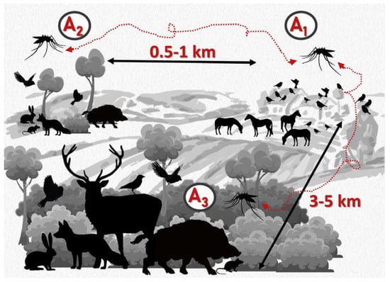 On each of the nine farms, three areas were selected to account for a variable gradient of wildlife-livestock interaction that could drive the risk of WNV infection in the farm environment (Figure 2), either from wild birds on the farm or from birds in the vicinity of the farm. These areas included: (i) the farm environment where horses interact with wild birds (Area 1, A1); (ii) an area in-between the farm and a wildlife-dominated area at a 0.5-1 km linear distance to the farm where interactions are feasible but limited (Area 2, A2); and iii) a wildlife-dominated area at a 3–5 km linear distance from the farm with no wildlife-livestock interactions (Area 3, A3). Distance ranges separating the study areas were selected based on known daily home ranges of Culex spp. mosquitoes that rarely fly few hundred meters away from birth places, and the maximum reported travelling distance of 5 km [12]. This approach was undertaken with the dual intention of (1) analyzing the influence of the local WNV mosquito vector population, and (2) being able to infer risks to equine farms from the neighborhood at distances easily bridged by resident birds and, eventually, by mosquito vectors.