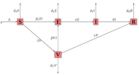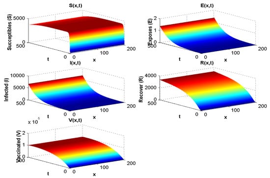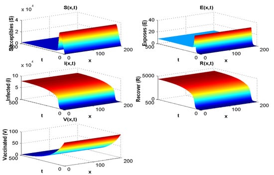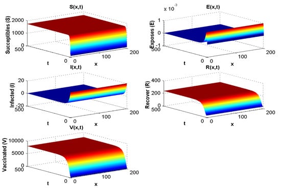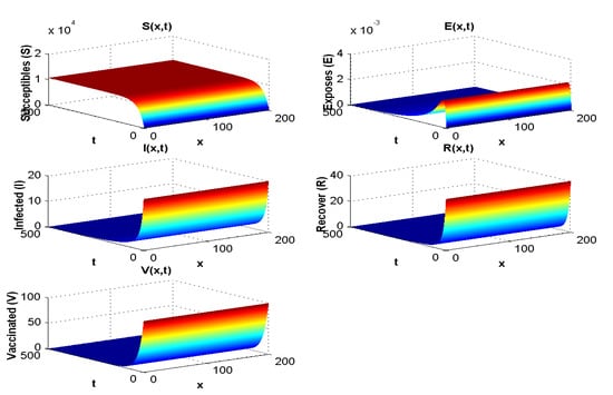 where S, E, I, R, and V are the population of susceptible, exposed, infected, recovered (and definitely immunized), and vaccinated at the position x at time t, respectively. The susceptible population reproduces at a constant rate and is infected at a rate , where is the contact rate per day between the susceptible and infected populations and , , , , and are, respectively, the mortality rates of susceptible, exposed, infected, recovered, and vaccinated people in the studied region. The parameter is the vaccination rate against COVID-19 in this population. The recovered population is produced from the infected at a rate . We assume that the population moves in the region according to Fick’s law [], and ’s being the diffusion coefficients and the Laplacian operator. In this work, we consider the system (1) with initial conditions as follows