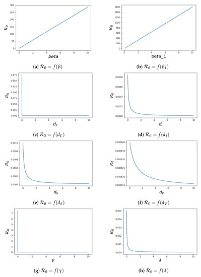 For the sensitivity analysis, we discovered that some of the parameters, i.e., and , cause to increase, while other parameters, corresponding to , and , cause it to decrease.