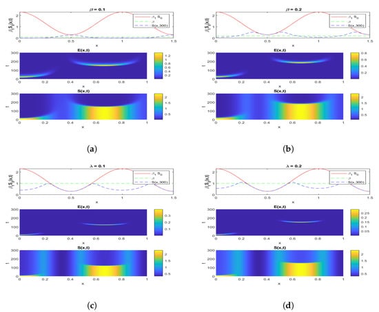 To demonstrate the influence of the spatial diffusion in the model, we used the method presented in [] by using implicit–explicit finite differences, where the Laplacian term is discretised implicitly (for numerical stability, allowing for a relatively large time stepping), whereas nonlinear terms are handled explicitly. We assume and the diffusion term . Furthermore, we assume and with and in order to have a wave-like or exponential propagation of the disease. When varying , we chose and and when varying , we chose . Other parameters were chosen from Table 2.