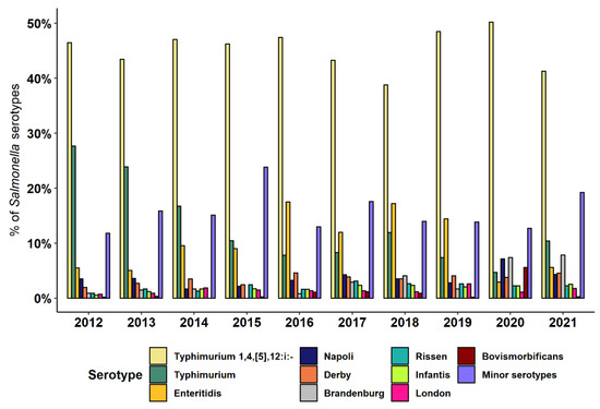 A total of 168 Salmonella serotypes were identified (Table S1), albeit few were responsible for the majority of human infection cases (Table 1). S. ser. Typhimurium 1,4,[5],12:i:-, S. ser. Typhimurium, and S. ser. Enteritidis were predominant during almost the entire time period, except for the last two years when S. ser. Brandenburg (in both 2020 and 2021) and S. ser. Napoli (in 2020) were the most frequent serotypes together with S. ser. Typhimurium 1,4,[5],12:i:- (Figure 1). The distribution of Salmonella serotypes differed during the study period, with a sharp decrease in the occurrence of S. ser. Typhimurium (Wilcoxon-type test for trend, p < 0.05) and a generally stable occurrence of S. ser. Typhimurium 1,4,[5],12:i: and S. ser. Enteritidis. The prevalence of the remaining seven most frequent serotypes increased over the years, especially S. ser. Brandenburg (prevalence, 0.9% in 2012 vs. 7.8% in 2021; p < 0.05), S. ser. Infantis (0.5% vs. 2.5%; p < 0.01), and S. ser. Derby (1.9% vs. 4.6%; p < 0.05), while no substantial changes in prevalence were detected for S. ser. Napoli (prevalence, 3.5% vs. 4.3%) during the study period (Figure 1).