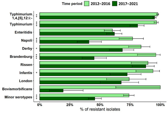 Prevalence and 95% CI of MDR in the most frequent serotypes recorded in the two halves of the study period. Asterisks denote significant differences in the prevalence of MDR between the two study periods (Pearson’s chi-squared test, * p < 0.05; ** p < 0.01; *** p < 0.001).